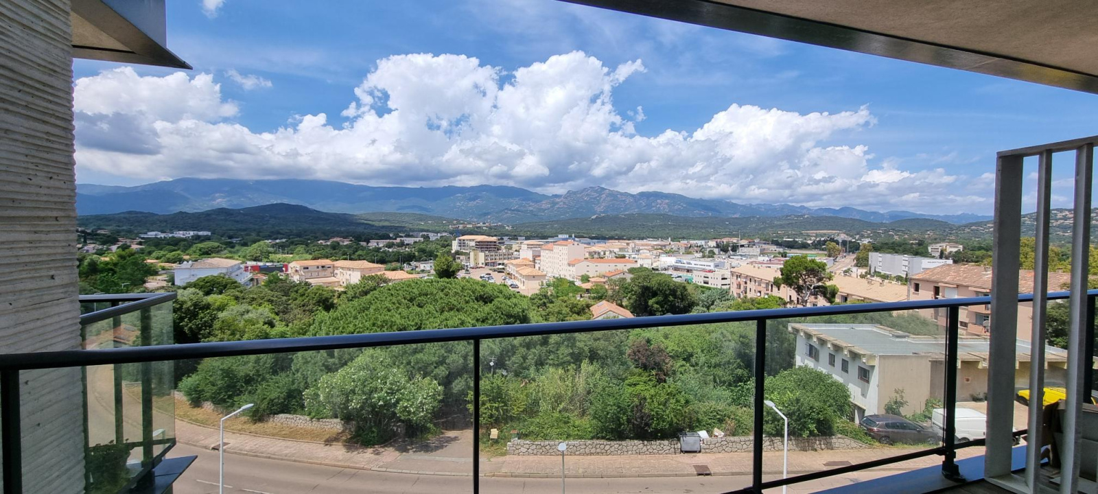 Une terrasse avec vue dégagé sur la montagne et la ville.