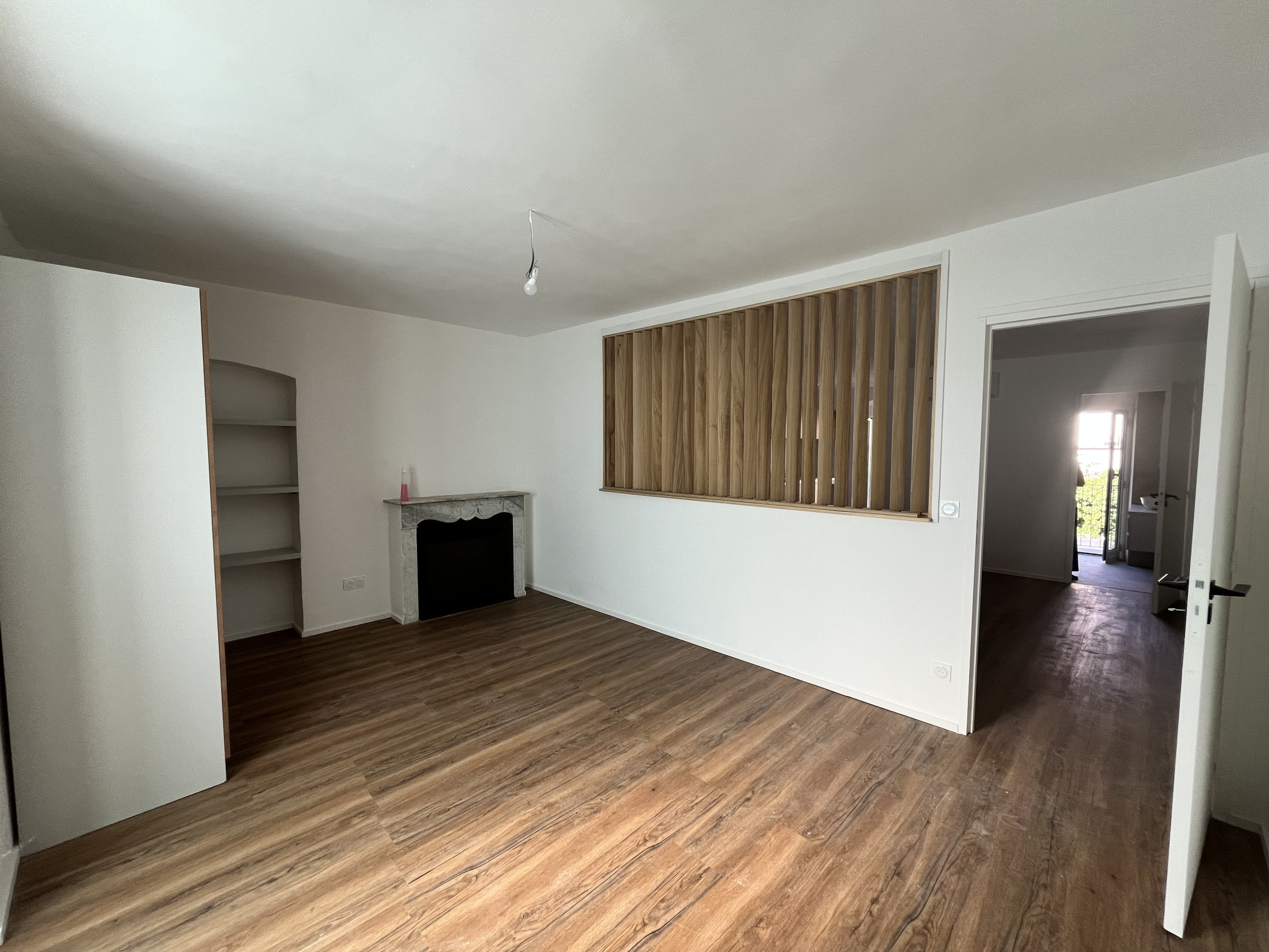 - Une grande pièce de vie avec espace cuisine semi-équipée et accès balcon.