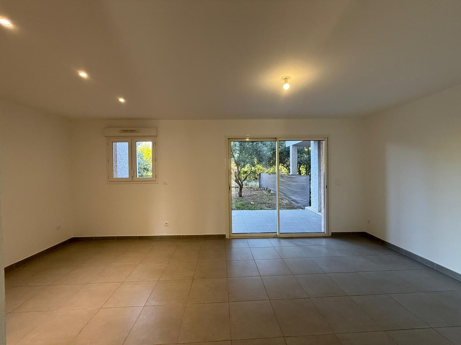 En exclusivité, proche du centre ville de Folelli, appartement T3 RDC  composé d'une entrée avec placard, un séjour ouvert sur le coin cuisine, deux chambres, une salle de bains avec wc, une belle terrasse couverte ainsi qu'un jardin privatif d'une surface de 80m² environ.